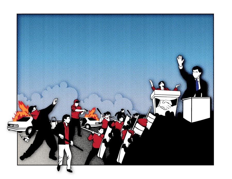 Mais le principe de base ne varie pas pour autant, et sera défendu par la force à toute occasion. En réalité, il est même le principe politique qui justifie l'usage de la force partout dans le monde (rétablissement de l'ordre, ingérence "humanitaire" et "guerre préventive"). Ce principe repose aussi sur le mythe de la "volonté générale" souvent dénoncé comme "tyrannie de la majorité". Ce mythe est savamment entretenu dans toutes les sphères de la société et au sein même des milieux contestataires. Cette fausse conscience repose sur l'idée que tout les "citoyens", voir même les êtres humains partagent les mêmes intérêts, les mêmes désirs et la même destinée. En réalité ce mythe de la volonté générale et des intérêts communs existe précisément pour invisibiliser les antagonismes de classes, les relations de pouvoir et la violence qu'elles impliquent et brider ainsi l'autonomie individuelle et collective. Et c'est dans ces frictions que le pouvoir tente de récupérer, par essence, le monopole de la gestion jusque dans les luttes, les décisions, les affects, les habitudes sociales, les identités qui prétendent s'y opposer pour les façonner à son image. Et c'est pourquoi il n'y a de perspective révolutionnaire dans la fuite, dans la transgression ou dans le simple fait de "s'abstenir" mais seulement des échappatoires existentielles (même lorsqu'elles peuvent être un signe ou une nécessité ponctuelle). Ce n'est pas par la "performance" ou en théorisant la "transcendance" qu'on menace la domination, c'est en s'y attaquant directement (sans spectacle, et sans médiations) qu'on ouvre les possibilités de la dépasser, et de la détruire.